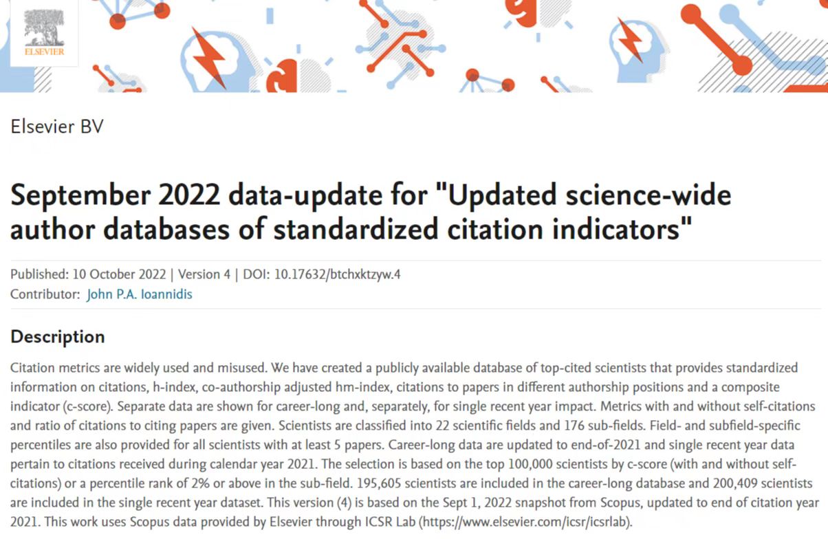 该榜单数据更新至2021年底,使用截至2022年9月1日的所有Scopus作者进行计算,以论文被引次数、h指数、hm指数等六种关键因素指标进行综合评估。考虑到不同子研究领域的差异,从近700万名科学家中遴选出世界排名前2%的科学家,涵盖文、理、工学科,包括了22个领域和176个子学科,更新的数据中还显示了每位科学家在其子学科内的综合引用指数排名。