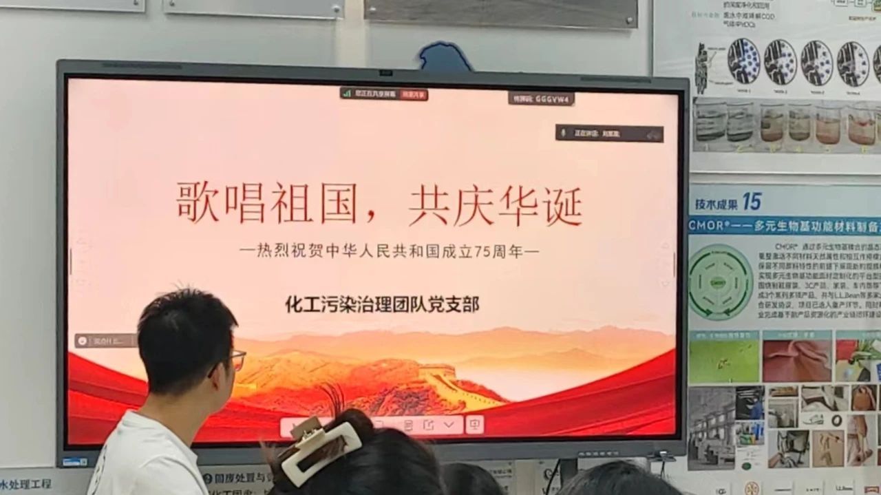 值此中华人民共和国成立75周年之际,化工污染治理团队党支部于2024年9月26日在新实训楼C909组织召开了以“歌唱祖国,庆祝华诞”为主题的党日活动。本次活动旨在通过回顾历史、缅怀先烈、歌唱祖国,激发全体党员的爱国情怀,进一步增强党组织的凝聚力和战斗力。本次会议由支部副书记刘星晨同志主持,以线上线下相结合的方式进行。